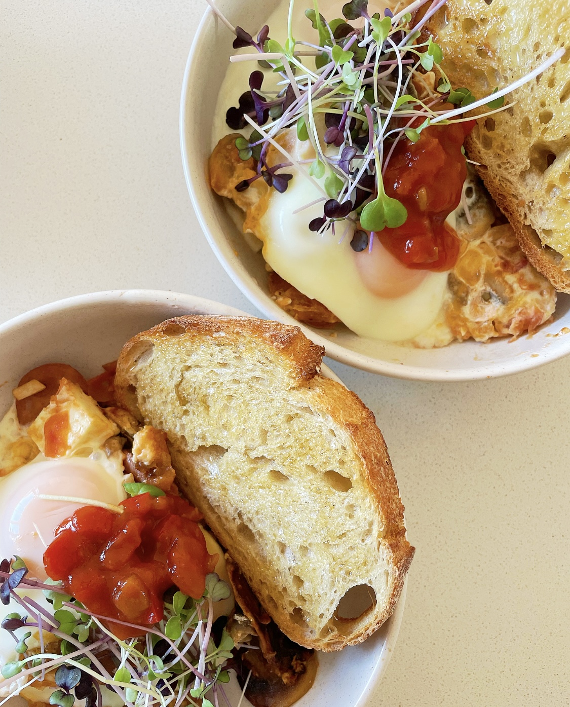 Shakshuka is a fun and flavourful way to mix up your typical eggs for breakfast. There are so many variations and possibilities with shakshuka, but please enjoy this one I have created with delicious ingredients like halloumi and chorizo served with sourdough, salsa and spicy micro-greens.