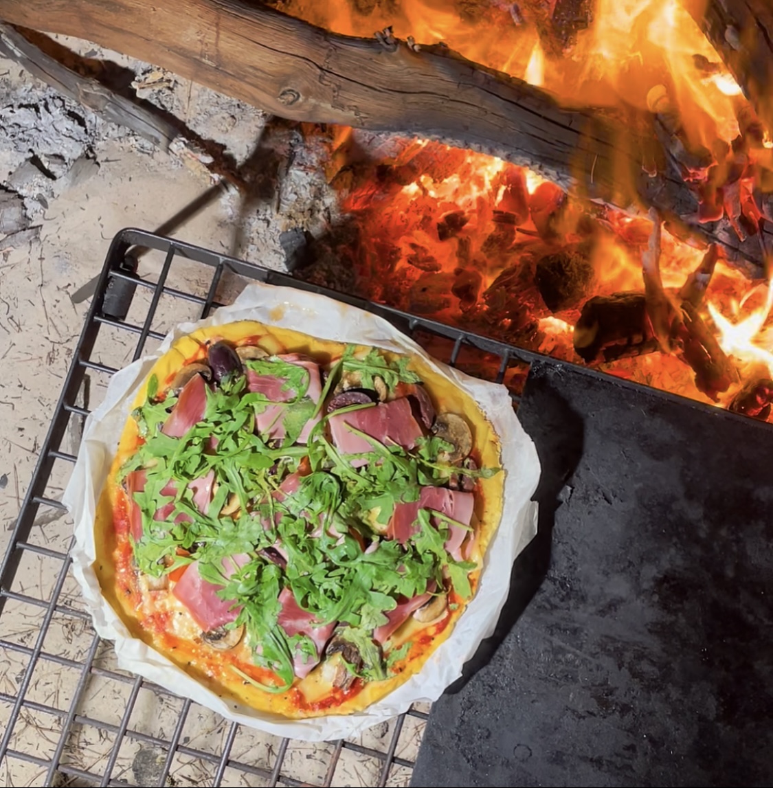 - Put on desired pizza toppings. I used tomato passata sauce, cheese, olives, mushrooms, capsicum, rocket and prosciutto. Then cook in the oven for 15-20 minutes or until the base is completely cooked through. If the base is overcooked it will be dry and if it is undercooked it won't taste great.