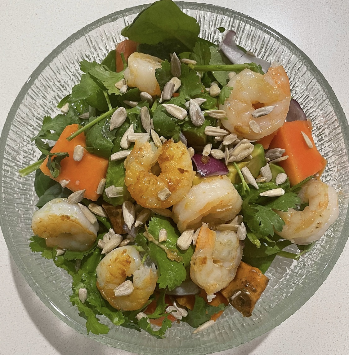 - Divide the remaining ingredients into two bowls with the sweet potato, prawns and sunflower seeds.2 large handfuls Spinach, 2 small handfuls Fresh coriander leaves, 2/3 cup Papaya, 1 small avocado, 1 tablespoon Purple onion, 1 tablespoon Walnut oil