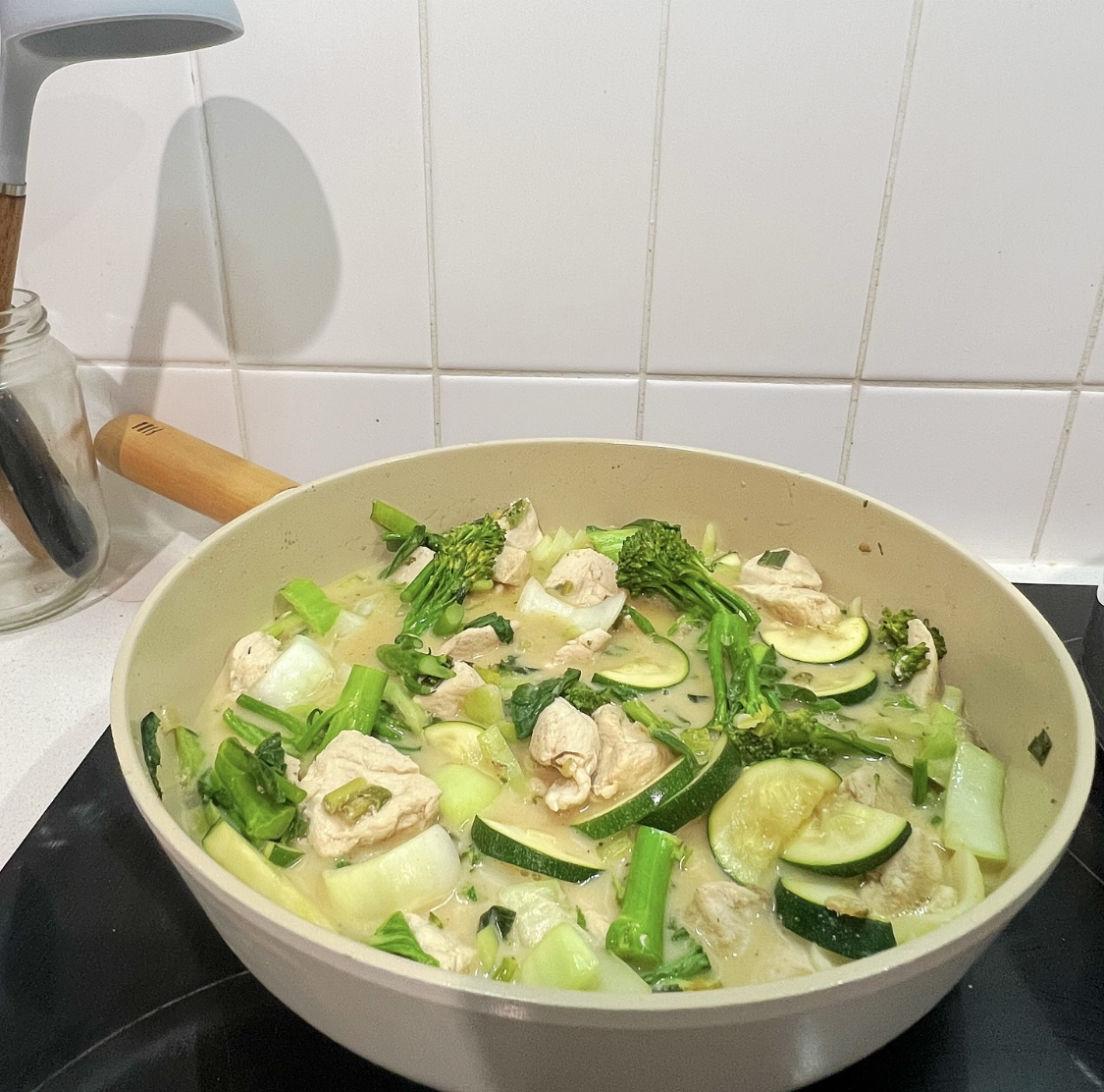 - Then add chicken breast and cook until the outsides have browned, then add the remaining ingredients and let it simmer for 20-30 minutes.2 small chicken breasts, 1 zucchini, 1 bunch broccolini, 2 bok choy's, 2 tablespoons Tamari soy sauce, 400ml canned coconut milk, 1/4 teaspoon cayenne pepper